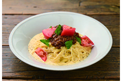 Cafe Madu青山店が参加いたします。・卵のカルボナーラとひき肉、フレッシュトマトとバジルの香りを添えて ¥1,500(税込)